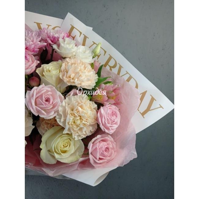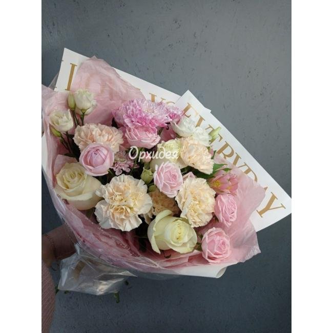 Каждая изготавливаемая флористом цветочная композиция является уникальной и может отличаться внешним видом, размером и оттенками цвета. Также возможны замены по ассортименту и составу цветов в зависимости от сезонности, наличия цветов и т.п. факторов. Итоговое исполнение заказа может незначительно отличаться от иллюстрации на сайте. При этом каждая цветочная композиция составляется из свежих цветов, и флористы предпринимают все усилия для того, чтобы цвет, форма цветочной работы как можно полнее соответствовали иллюстрации на сайте.