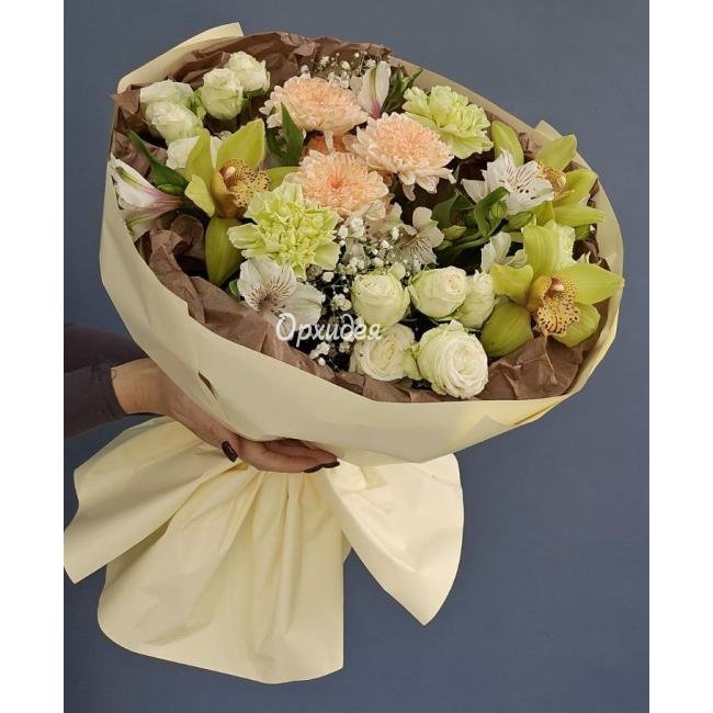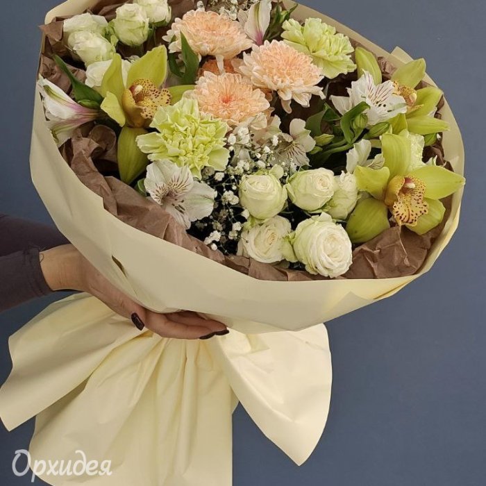 Каждая изготавливаемая флористом цветочная композиция является уникальной и может отличаться внешним видом, размером и оттенками цвета. Также возможны замены по ассортименту и составу цветов в зависимости от сезонности, наличия цветов и т.п. факторов. Итоговое исполнение заказа может незначительно отличаться от иллюстрации на сайте. При этом каждая цветочная композиция составляется из свежих цветов, и флористы предпринимают все усилия для того, чтобы цвет, форма цветочной работы как можно полнее соответствовали иллюстрации на сайте.