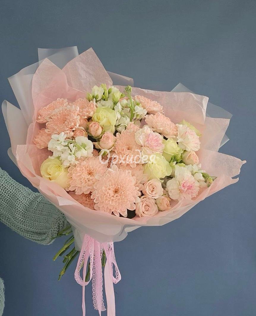 Каждая изготавливаемая флористом цветочная композиция является уникальной и может отличаться внешним видом, размером и оттенками цвета. Также возможны замены по ассортименту и составу цветов в зависимости от сезонности, наличия цветов и т.п. факторов. Итоговое исполнение заказа может незначительно отличаться от иллюстрации на сайте. При этом каждая цветочная композиция составляется из свежих цветов, и флористы предпринимают все усилия для того, чтобы цвет, форма цветочной работы как можно полнее соответствовали иллюстрации на сайте.