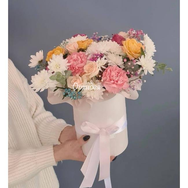 Каждая изготавливаемая флористом цветочная композиция является уникальной и может отличаться внешним видом, размером и оттенками цвета. Также возможны замены по ассортименту и составу цветов в зависимости от сезонности, наличия цветов и т.п. факторов. Итоговое исполнение заказа может незначительно отличаться от иллюстрации на сайте. При этом каждая цветочная композиция составляется из свежих цветов, и флористы предпринимают все усилия для того, чтобы цвет, форма цветочной работы как можно полнее соответствовали иллюстрации на сайте.