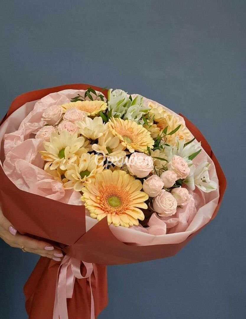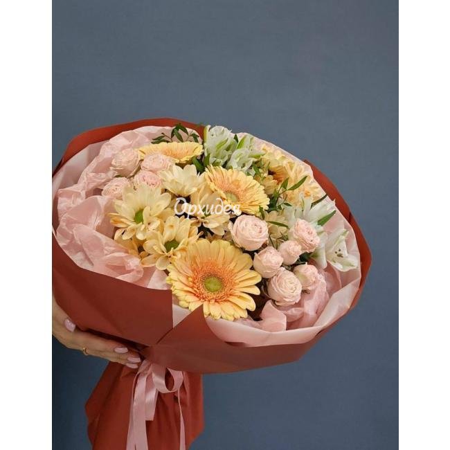 Каждая изготавливаемая флористом цветочная композиция является уникальной и может отличаться внешним видом, размером и оттенками цвета. Также возможны замены по ассортименту и составу цветов в зависимости от сезонности, наличия цветов и т.п. факторов. Итоговое исполнение заказа может незначительно отличаться от иллюстрации на сайте. При этом каждая цветочная композиция составляется из свежих цветов, и флористы предпринимают все усилия для того, чтобы цвет, форма цветочной работы как можно полнее соответствовали иллюстрации на сайте.