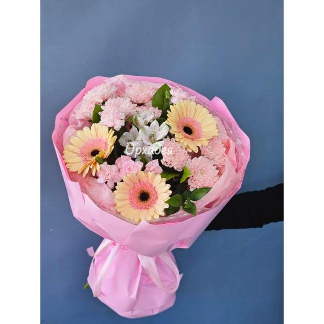 Каждая изготавливаемая флористом цветочная композиция является уникальной и может отличаться внешним видом, размером и оттенками цвета. Также возможны замены по ассортименту и составу цветов в зависимости от сезонности, наличия цветов и т.п. факторов. Итоговое исполнение заказа может незначительно отличаться от иллюстрации на сайте. При этом каждая цветочная композиция составляется из свежих цветов, и флористы предпринимают все усилия для того, чтобы цвет, форма цветочной работы как можно полнее соответствовали иллюстрации на сайте.