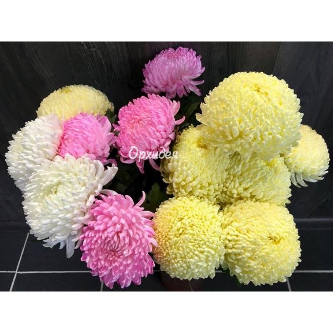 Описание Хризантема в ассортименте, различная цветовая гамма. Просим при оформлении заказа уточнять цвет и количество цветка у флориста!