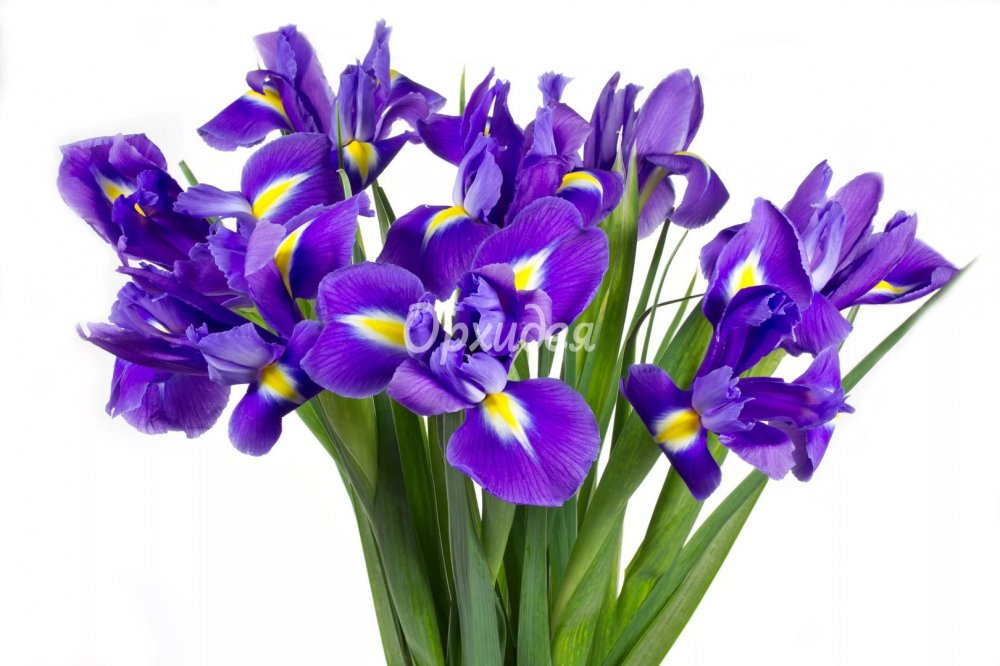 Описание Ирисы в ассортименте, цветовая гамма может меняться от глубокого синего к фиолетовому. Просим при оформлении заказа уточнять окрас и количество цветка у флориста!