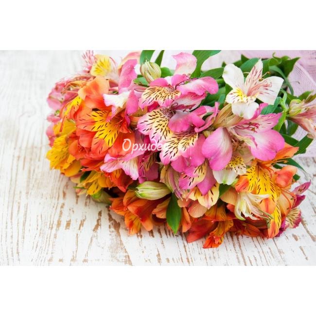 Описание Альстромерии в ассортименте, различная цветовая гамма. Просим при оформлении заказа уточнять окрас и количество цветка у флориста!