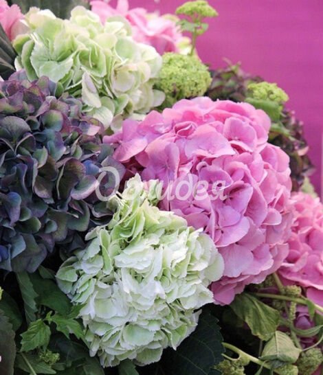 Описание Гортензия в ассортименте, голубого, розового, белого цвета. Просим при оформлении заказа уточнять цвет и количество цветка у флориста!