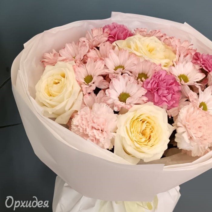 Каждая изготавливаемая флористом цветочная композиция является уникальной и может отличаться внешним видом, размером и оттенками цвета. Также возможны замены по ассортименту и составу цветов в зависимости от сезонности, наличия цветов и т.п. факторов. Итоговое исполнение заказа может незначительно отличаться от иллюстрации на сайте. При этом каждая цветочная композиция составляется из свежих цветов, и флористы предпринимают все усилия для того, чтобы цвет, форма цветочной работы как можно полнее соответствовали иллюстрации на сайте.