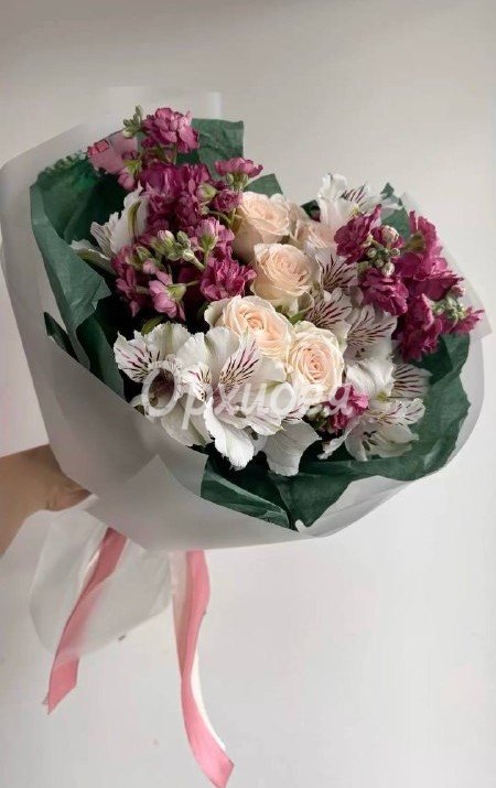 Каждая изготавливаемая флористом цветочная композиция является уникальной и может отличаться внешним видом, размером и оттенками цвета. Также возможны замены по ассортименту и составу цветов в зависимости от сезонности, наличия цветов и т.п. факторов. Итоговое исполнение заказа может незначительно отличаться от иллюстрации на сайте. При этом каждая цветочная композиция составляется из свежих цветов, и флористы предпринимают все усилия для того, чтобы цвет, форма цветочной работы как можно полнее соответствовали иллюстрации на сайте.