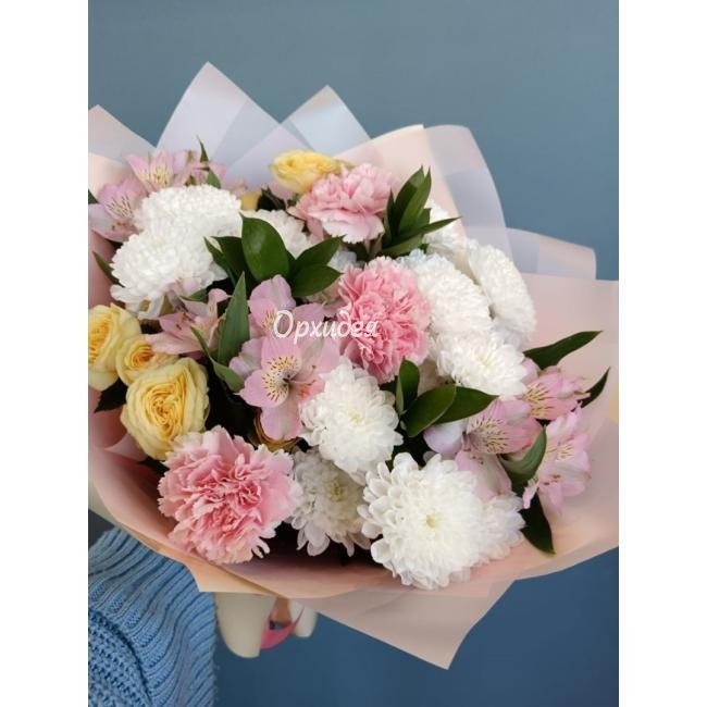 Каждая изготавливаемая флористом цветочная композиция является уникальной и может отличаться внешним видом, размером и оттенками цвета. Также возможны замены по ассортименту и составу цветов в зависимости от сезонности, наличия цветов и т.п. факторов. Итоговое исполнение заказа может незначительно отличаться от иллюстрации на сайте. При этом каждая цветочная композиция составляется из свежих цветов, и флористы предпринимают все усилия для того, чтобы цвет, форма цветочной работы как можно полнее соответствовали иллюстрации на сайте.